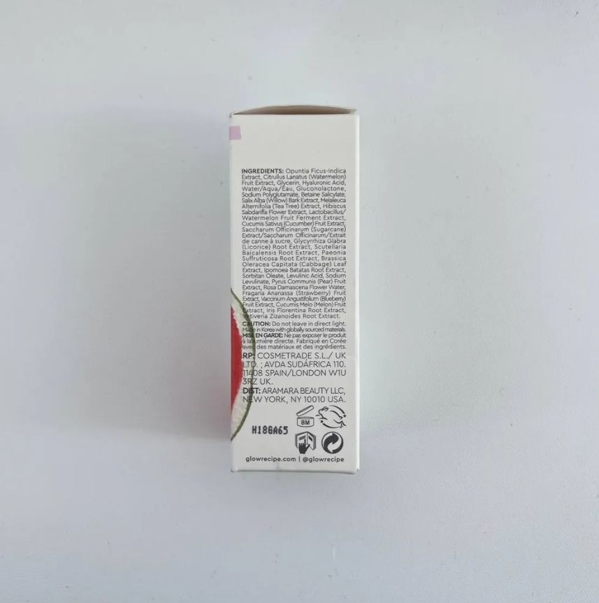 Opuntia Ficus-Indica (Cactus) Extract, Citrullus Lanatus (Watermelon) Fruit Extract, Glycerin, Hyaluronic Acid, Aqua, Gluconolactone, Sodium Polyglutamate, Betaine Salicylate, Salix Alba (Willow) Bark Extract, Melaleuca Alternifolia (Tea Tree) Extract, Hibiscus Sabdariffa Flower Water, Watermelon, Lactobacillus, Cucumis Sativus (Cucumber) Fruit Extract, Saccharum Officinarum (Sugarcane) Extract, Glycyrrhiza Glabra (Licorice) Root Extract, Scutellaria Baicalensis Root Extract, Paeonia Suffruticosa Root Extract, Brassica Oleracea Capitata (Cabbage) Leaf Extract, Ipomoea Batatas Root Extract, Sorbitan Oleate, Levulinic Acid, Sodium Levulinate, Molasses, Benzyl Benzoate, Limonene, Parfum.
