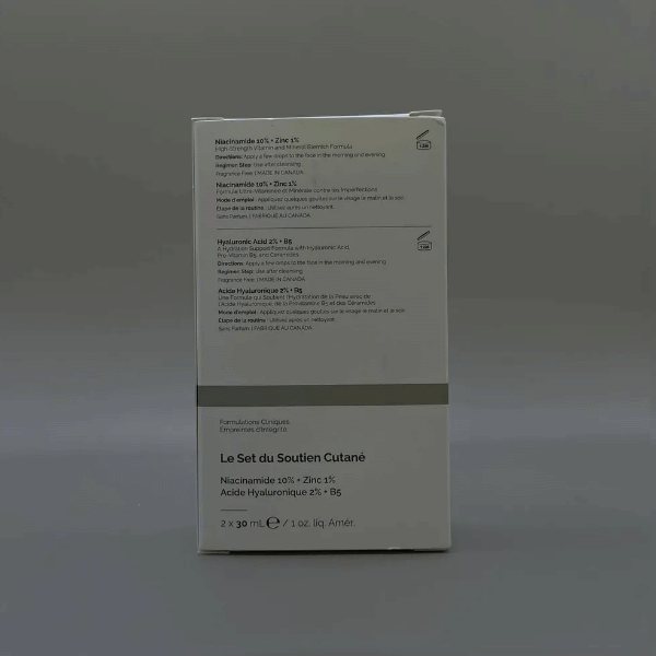 Hyaluronic Acid 2% + B5 (30ml): Aqua (Water), Sodium Hyaluronate, Propanediol, Pentylene Glycol, Hydrolyzed Hyaluronic Acid, Sodium Hyaluronate Crosspolymer, Phospholipids, Sphingolipids, Panthenol, Ahnfeltiopsis Concinna Extract, Glycerin, Polysorbate 20, Citric Acid, Sodium Citrate, P-Anisic Acid, Tocopherol, Trisodium Ethylenediamine Disuccinate, Caprylyl Glycol, Ethoxydiglycol, Ethylhexylglycerin, Hexylene Glycol, Phenoxyethanol, Chlorphenesin. Niacinamide 10% + Zinc 1% (30ml): Niacinamide 10% + Zinc 1% (30ml): Aqua (Water), Niacinamide, Pentylene Glycol, Zinc PCA, Dimethyl Isosorbide, Tamarindus Indica Seed Gum, Xanthan Gum, Isoceteth-20, Ethoxydiglycol, Phenoxyethanol, Chlorphenesin.