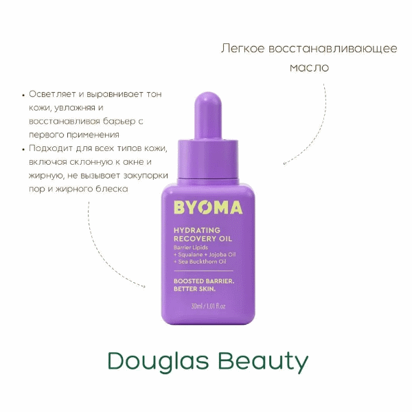 Подарите своей коже роскошный уход с сывороткой BYOMA Hydrating Recovery Oil объемом 30 мл. Это высокоэффективное средство для лица помогает восстанавливать и увлажнять кожу, удовлетворяя ее потребности в интенсивном питании и заботе. Экстракты натуральных масел и активных компонентов легко проникают в глубокие слои эпидермиса, обеспечивая максимальное увлажнение и создавая защитный барьер от воздействия внешних факторов. Подходит для всех типов кожи, сыворотка создана с целью вернуть ей здоровое сияние, гладкость и молодость, которые так важны для уверенности в себе и своей красоте. Приятная текстура и легкий аромат делают использование BYOMA Hydrating Recovery Oil по-настоящему приятным ритуалом, который вы захотите повторять изо дня в день. Формула сыворотки была разработана с учетом последних достижений в косметологии, чтобы каждая капля приносила вашей коже только пользу. Добавьте это must-have средство в свой повседневный уход за кожей и наслаждайтесь видимыми результатами уже через несколько применений. Нежные растительные масла помогают успокоить раздраженную кожу, уменьшают покраснения и воспаления, а также способствуют регенерации клеток, что делает сыворотку BYOMA Hydrating Recovery Oil идеальным выбором для тех, кто стремится к здоровому и ухоженному виду лица.