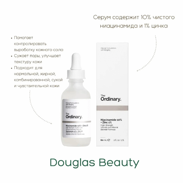Niacinamide 10% + Zinc 1% - это сыворотка с 10% витамином В3 и цинком в концентрации 1%. Витамин В3 уменьшает видимость увеличенных сальных желез (пор), улучшает гидратацию кожи и предотвращает изменение цвета, которое часто происходит при лечении дерматологических угрей. Цинк, содержащийся в препарате, ускоряет процесс регенерации кожи и сокращает время заживления ран. Косметическое средство имеет рН от 5,5 до 6,5. Не содержит спирт, силиконы или масла. Препарат веганский, во время его производства ни одно животное не пострадало.
